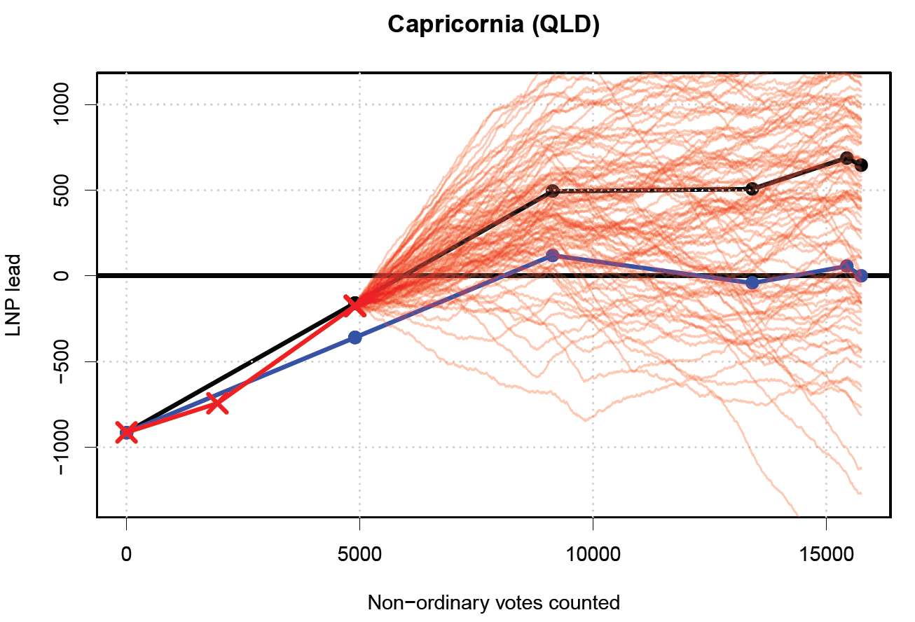 interquartile lines - the idea is that half of the time, your winnings per game after a certain number of games will be between the two red lines. For example, after 50 games, it's 50-50 whether your average winnings are above or below $8.20 (the median), and half the time your average winnings will be between $6.12 and $12.44. So if you paid only $6 a game, you're probably doing pretty well at this point!